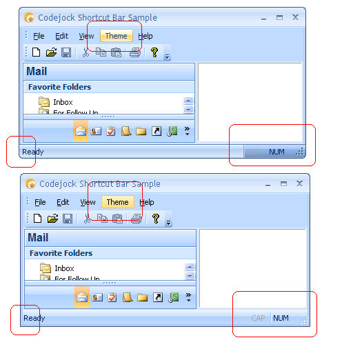 Then I noticed I could get the same behaviour with the sample application (as seen above). The top image is when the application starts up (which is how I thought it should look). The bottom image can be duplicated by switching the theme to "Office 2003" and then back to "Office 2007". I was expecting it to go back to the original look... |
